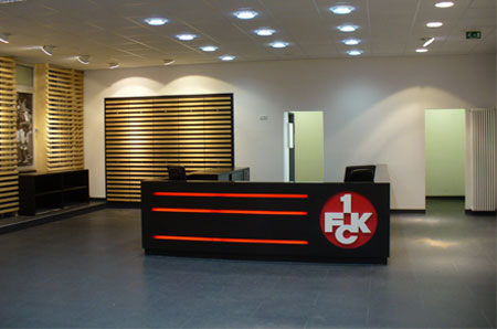 “Wir möchten uns den Fans öffen” - dieser Wunsch des Vereins und auch der neue Standort des Fanshops auf dem “Betze” wurden für das Konzept der Umgestaltung zum Programm. Spielszenen, eine Trainerbank und “die Westkurve” lassen den Fan bereits hier Stadionluft schnuppern.